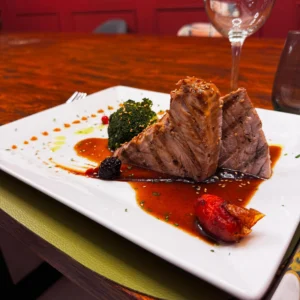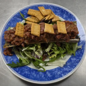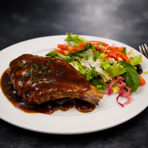 Con guarnición a elegir: patatas fritas de la casa o ensalada de lechuga y cebolla