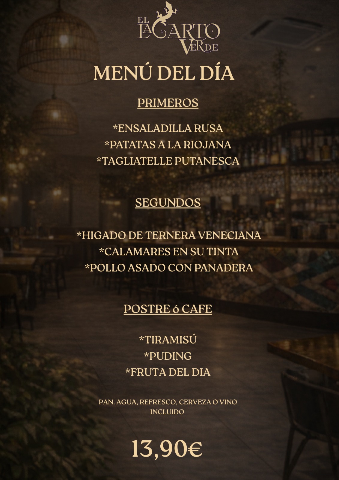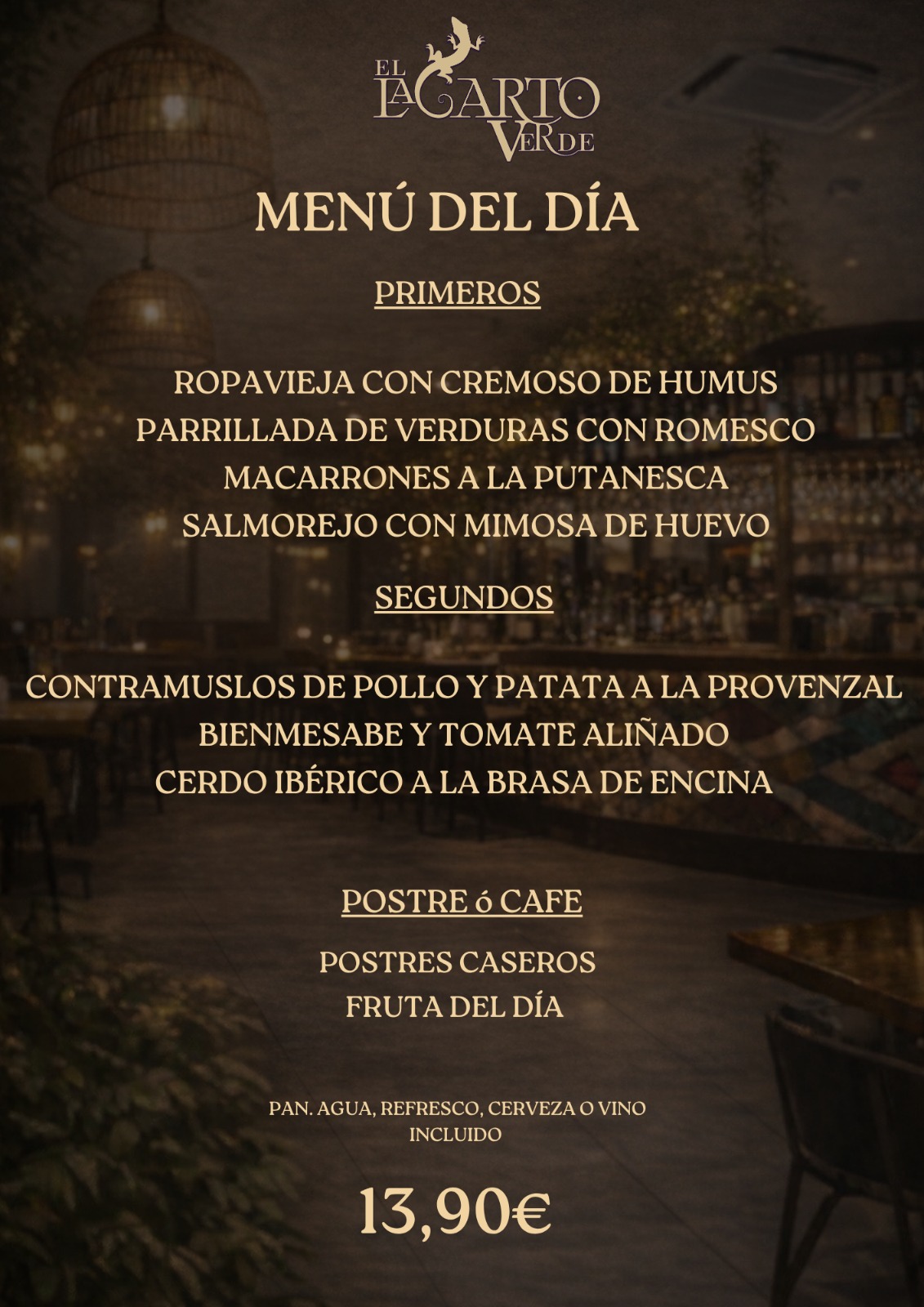 - Incluye primer plato, segundo, postre y bebida